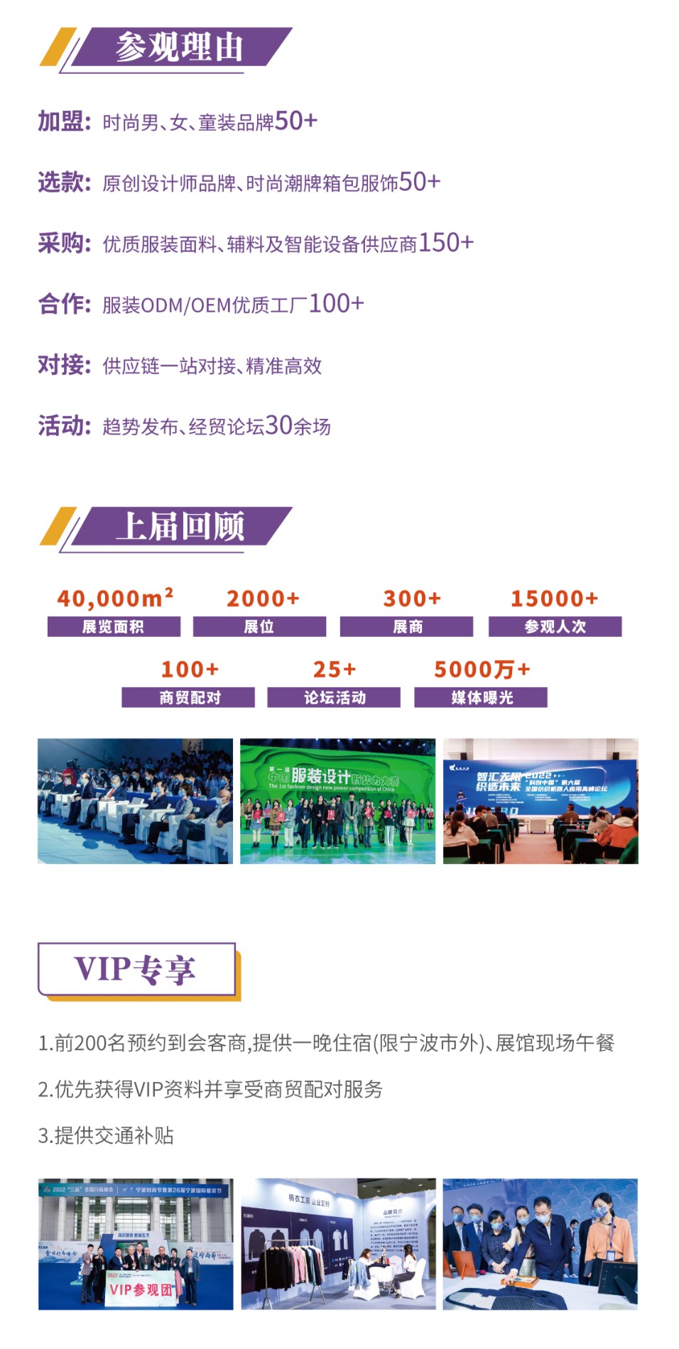宁波服装节创办于1997年,2019年提升为宁波时尚节,是宁波市政府会同中国纺织工业联合会等权威机构联合打造的国际性、专业化、平台型、全供应链大型经贸会展活动。宁波国际服装服饰博览会(以下简称服博会)是时尚节系列活动中的专业商贸交易平台,展览面积4万平方米,展商300+家,展出品牌500+,举办论坛活动20+场,吸引5万+名观众到会参观、采购。