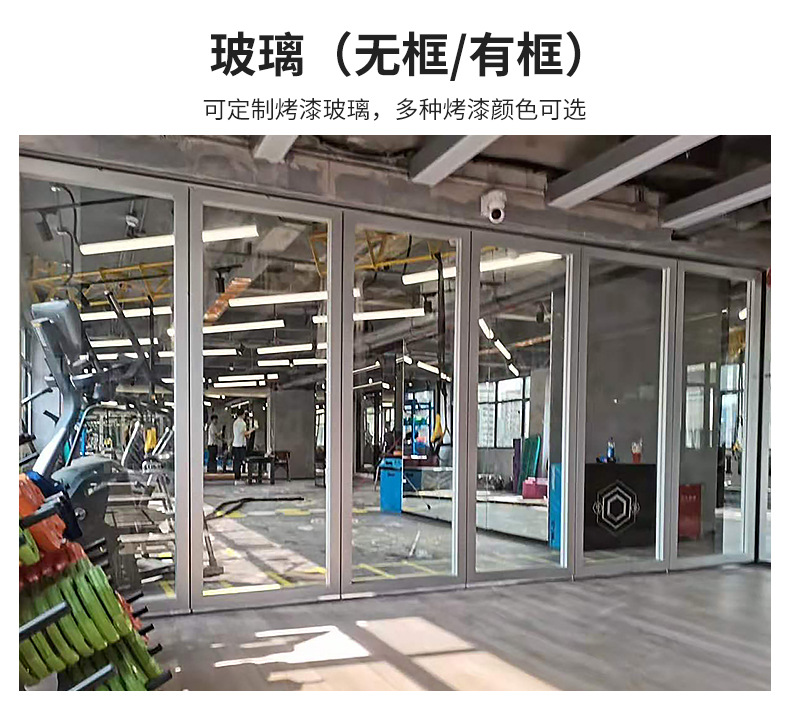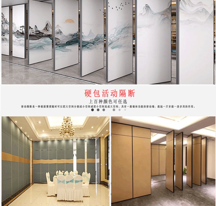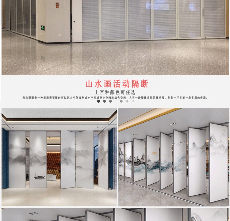 活动隔断墙的特点包括:活动隔断墙的轨道是安装在天花板上的,无需在地面上安装轨道;安装完成后隔断稳固可靠,不易摆动,安全性高;隔音效果好,最大隔音系数可达50dB;活动隔断墙隔热性能优良,根据不同的需求,把大空间分割成小空间,降低能耗。
